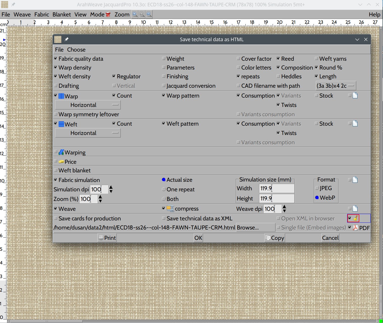 We’ve added a new space‑saving feature in ArahWeave to optimize the generation of fabric technical data. When converting HTML to PDF or embedding images directly into HTML to create a single file, the program can now automatically remove the separate image files, which are typically no longer needed. This helps keep your HTML directory uncluttered and, if your data is stored in a cloud service such as Dropbox, it also reduces storage consumption and speeds up synchronization.