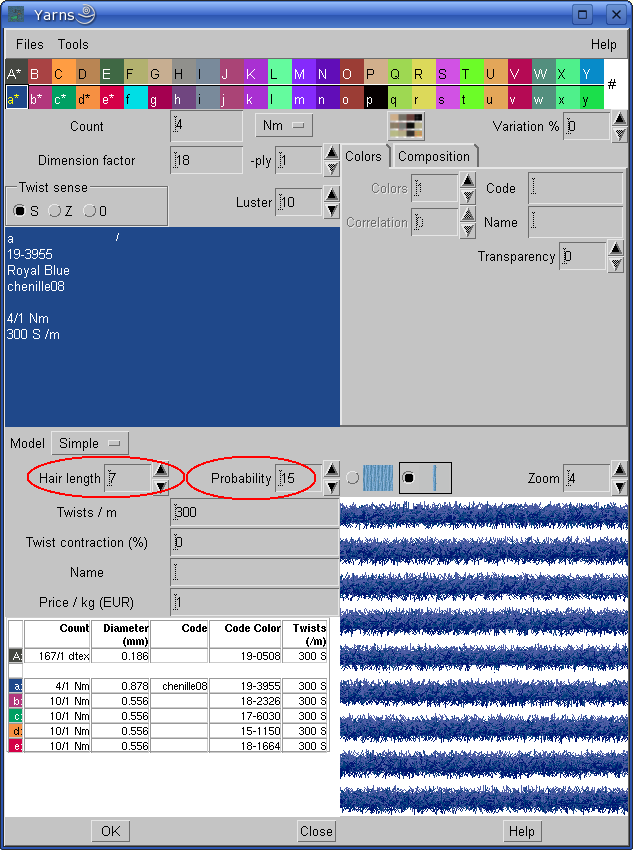 First, choose a yarn in the Yarns window. The basic chenille parameters are Hair length and Probability, which makes a hairy yarn, able to cover neighboring yarns. You can play a little with these options to get desired result.