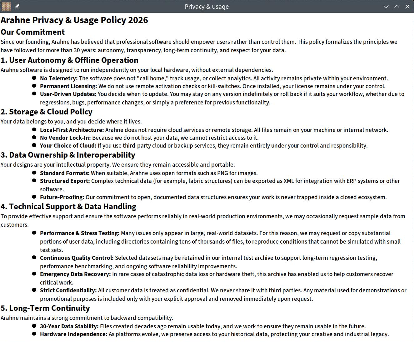 Not every company follows this trend. At Arahne, we’ve chosen a different path. We prioritize local data ownership, and our Privacy & Usage Policy makes it clear that users keep full control of their files without being pushed into remote storage. Cloud dependence isn’t a necessity; it’s a business choice, and we’ve made ours in favor of the user.